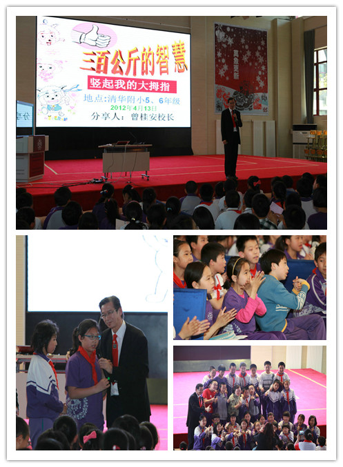 2012年4月13日——14日,国际赏识教育学会会长、马来西亚行知文教发展中心创办人曾桂安来到清华附小,为师生、家长做了四场关于赏识教育的报告会。