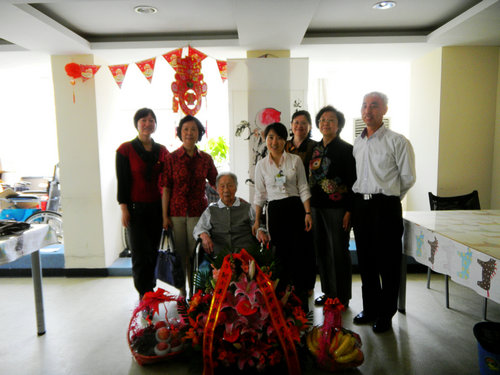 2012年5月8日上午,清华附小工会一行人,驱车来到位于朝阳区的一座疗养院,看望附小退休的百岁老教师,潘瑾茹老师。一起随行的还有清华大学离退休工作处副处长南彬女士及几位附小退休的老教师。