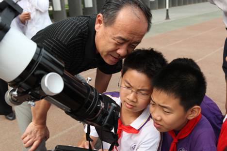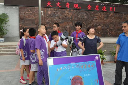 6月6日天空上演了罕见的天文现象——金星凌日,如果错过这次观测机会,下一次金星凌日要等到2117年。6月6日一大早,清华附小的学生一来到学校,醒目的大海报就映入了眼帘,随着校园广播播放的金星凌日的新闻声,学生马上被校园里的天文望远镜与LED屏的文字所吸引,立刻非常有秩序的排起了观测的队伍。清华附小科技组的全体老师带领天文社团的学生在学校的大操场、小操场开展了观测金星凌日的活动。