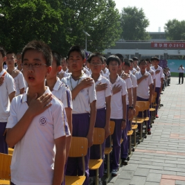 接下来,全体学生合唱校歌,“毕业”这个模糊的身影真的来到了他们身边。他们是那样的恋恋不舍,经历最后一次升旗,最后一节课,现在最后一次唱起了校歌,学生们全体起立,最后一次郑重地将右手放在胸前,宣读《清华附小学生誓词》。