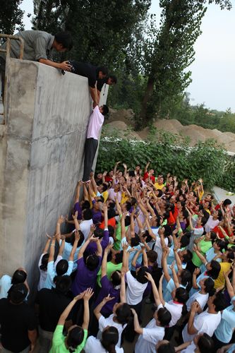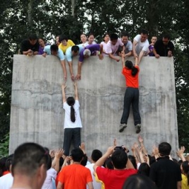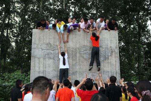 最后,所有的小队完成各自任务,来到毕业墙前,要共同完成爬越毕业墙这项任务。望着4.2米的高墙,所有人都意识到了个人的渺小,而同时也发现了团队的伟大力量。要过此墙,必须通过大家的配合与支持。此时,老师表现出了高度的责任感和乐于奉献的精神:身强力壮的男老师们主动站在墙下甘做人梯,充分发扬了“敢担当、敢碰硬”的精神,让其他老师踩着自己的肩膀爬上去;爬上去的老师也不忘记感恩,回头伸出手来拉还没有过墙的队友。所有人都不计较个人得失,当人梯地基的老师个个肩膀都被踩出了伤痕,但没有一个人喊苦喊累,个个咬牙坚持。就在这种精神的支持与鼓舞下,附小全体教师以破纪录的速度全部通过毕业墙,所有人在团队的支持下,超越自我,完成了个人无法完成的一个任务,为我们的拓展培训划上了一个圆满的句号,所有的小队通过这项活动,真正融合成为了一支强大的大队。