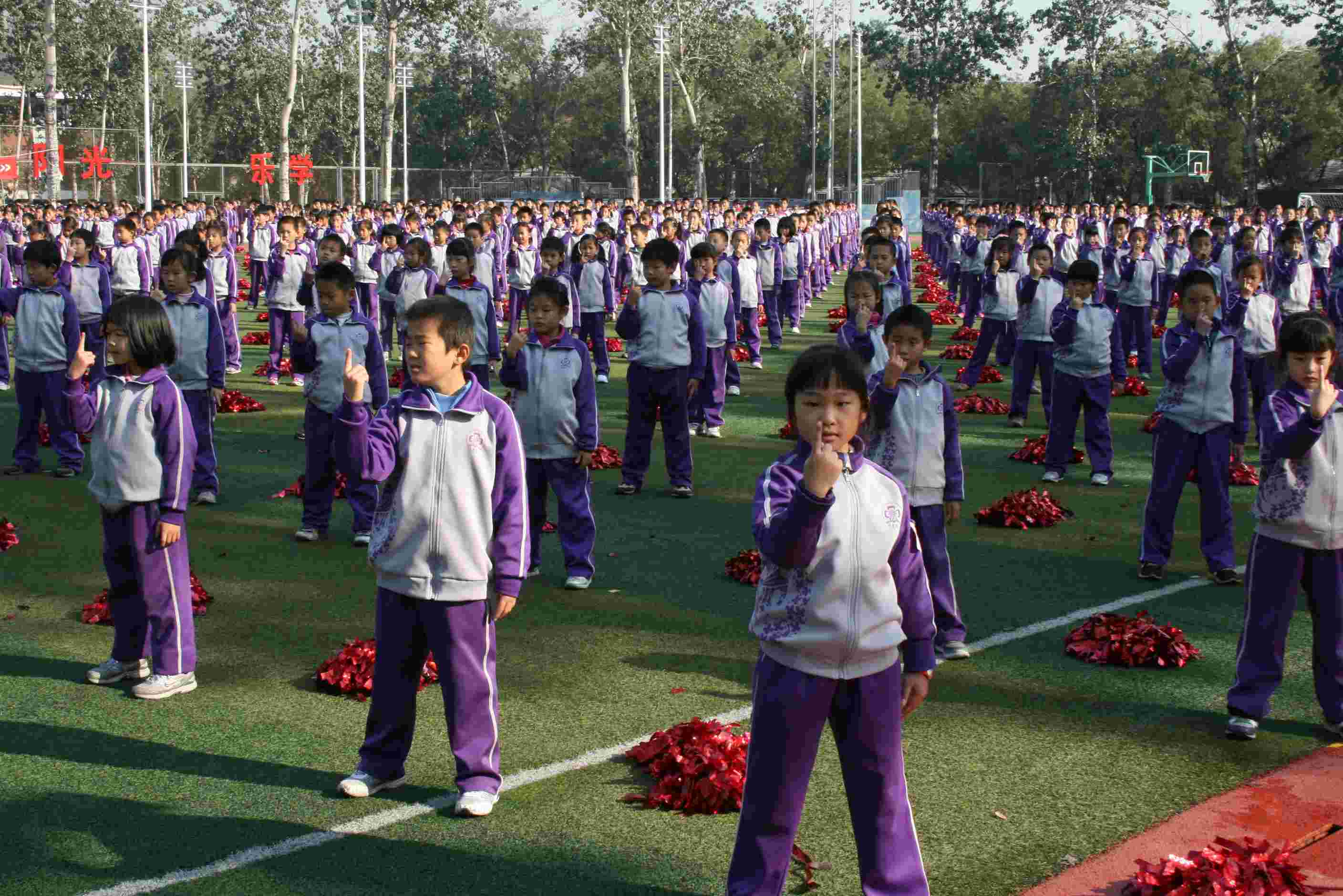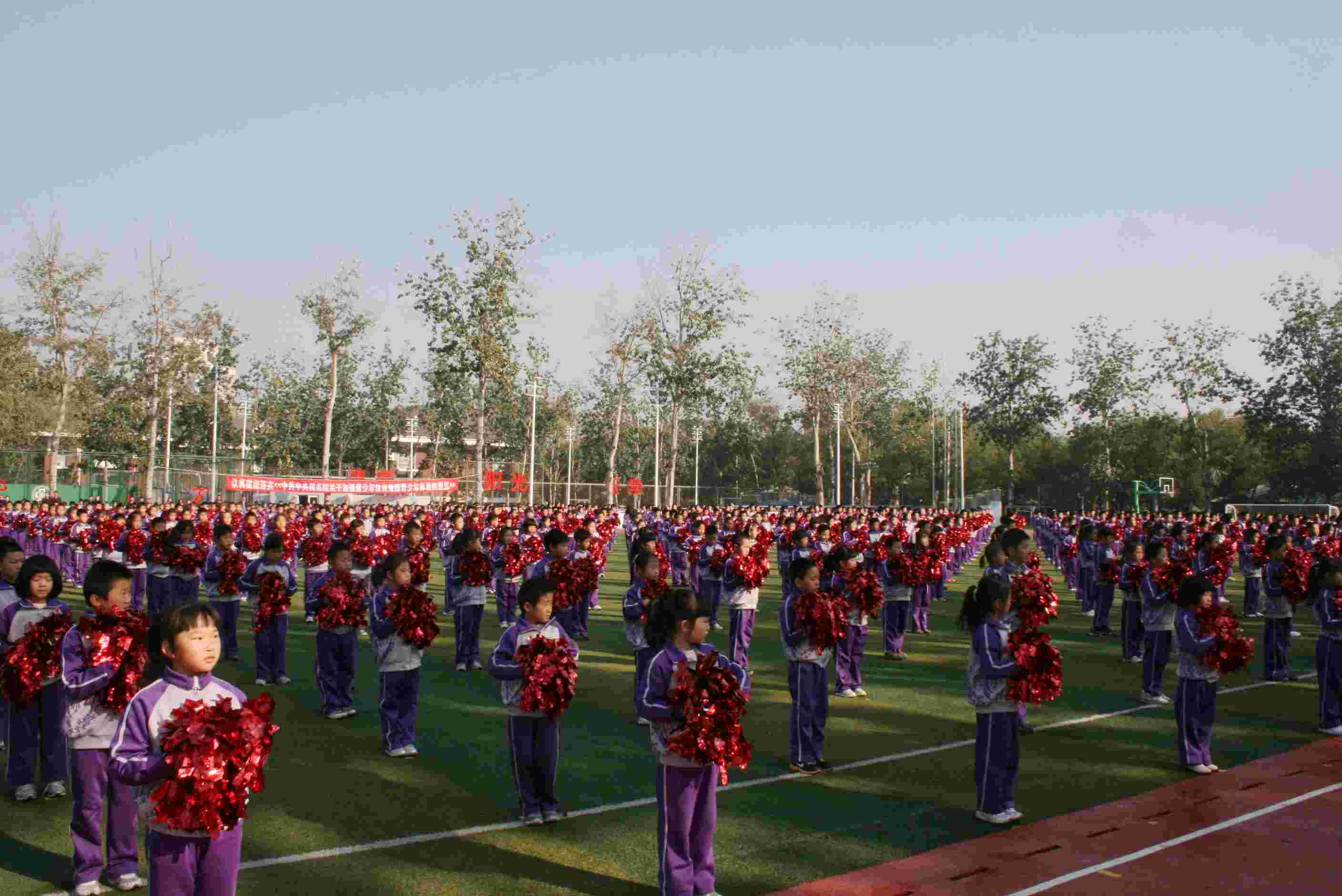 在大操场,三至六年级的学生通过做“国家颁布的两套操《七彩阳光》、《希望风帆》,武术操《旭日东升》,花球啦啦操、放松操、阳光亮眼操”,向海淀区教委领导展示了他们健康、阳光的精神面貌。在展示中,附小学子动作整齐划一、声音铿锵嘹亮、精神面貌健康阳光,给在场的所有人留下了深刻的印象,得到了领导及评委们的一致认可及好评。
