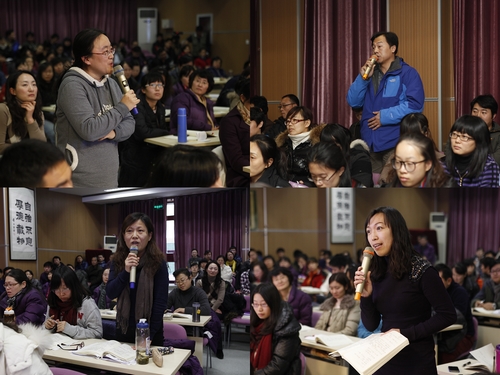 报告内容从实践中来,又带着理性的光辉,情感人,理真诚。最后,我校紫禁杯优秀班主任苗玉春和海淀区优秀辅导员李春虹老师对甄珍老师的讲座给予了回应,表达了对甄老师的敬意、敬佩和感谢。