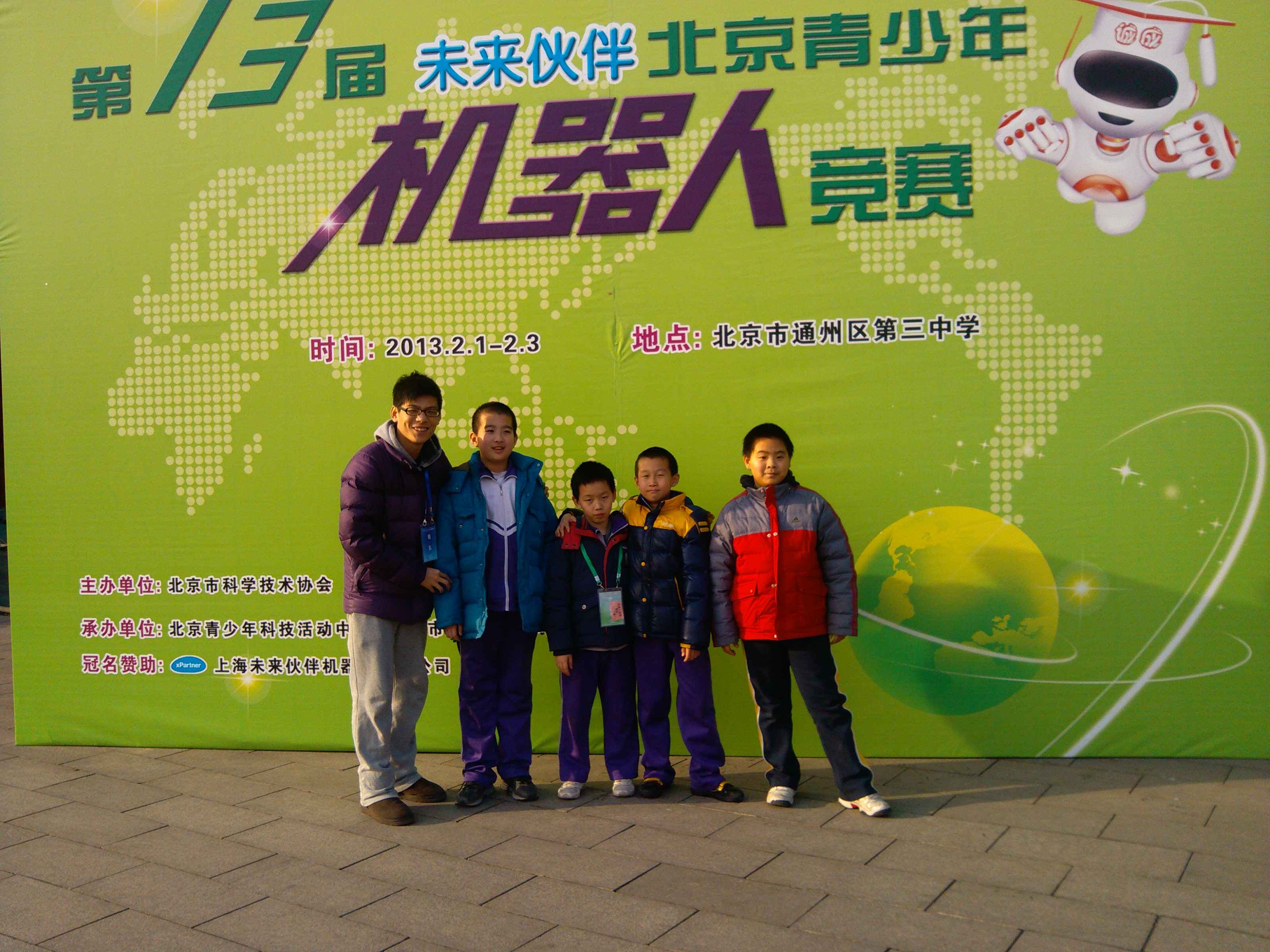 2013年2月1日—2月3日,来自北京市16个区县及中国儿童中心、北京青少年科技馆等180支队伍,参加在通州三中举办的“第十三届未来伙伴北京青少年机器人竞赛”活动。我校学生左思清、何沛豪、严顺其、宁厚然四名同学在VEX工程挑战赛项目中力拔头筹,以6胜2负的好成绩获得小学组一等奖殊荣。