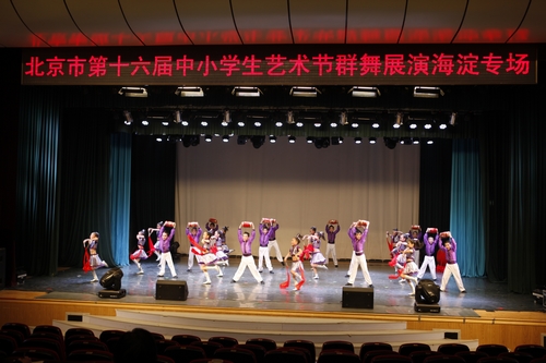 从北京市第十六届中小学生艺术节群舞展演——海淀专场传来好消息3月15日,在北京市海淀区青少年活动中心举行的海淀专场舞蹈大赛中,我校参赛的舞蹈《鼓舞少年》取得了历史性突破,经过指导老师和舞蹈团同学们的齐心努力,取得了北京市一等奖。