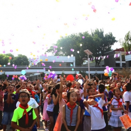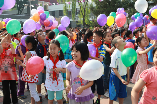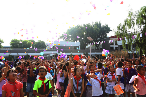 放飞梦想环节将第一板块内容推向高潮。每位同学都从身着卡通服装的老师手中接过多彩的气球。传递气球是呵护童心,更是播种梦想。集体放飞象征着梦想、责任和担当的多彩气球,五彩的气球在湛蓝天空中越飞越高,表达了清华附小师生捍卫童年,为实现中国梦而努力的决心。