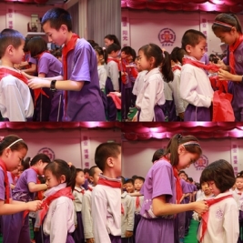 入队仪式上,六年级的老队员在授巾曲的伴奏下,为一年级的学生佩戴上了鲜艳的红领巾。老队员为新队员佩戴红领巾一直是我校的一项传统,这既是一种担当,更是一份责任的传递。