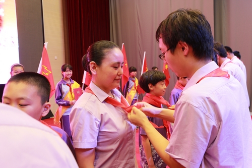 新加入的少年队员在队旗下庄严宣誓:我热爱中国共产党,热爱祖国,热爱人民,好好学习,好好锻炼,准备着:为共产主义事业贡献力量!誓言包含着清华少年成为“健康、阳光、乐学”的追求,也包含着“选择了清华,就选择了一生的责任”的庄严承诺。