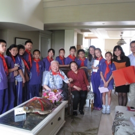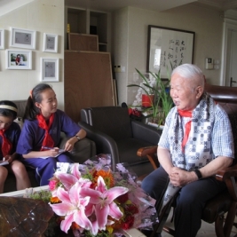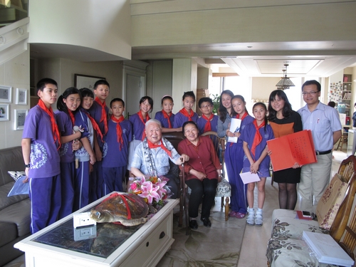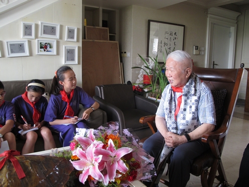 学生代表得到了吴良镛爷爷的热情接待。虽然已是九十余岁高龄,但吴良镛爷爷仍然思维敏捷,热情地回答了所有学生的提问。他还为学生代表讲述了自己的求学之路,以及在建筑方面的一些思考和想法。尤其当学生问到他为什么要从事建筑的研究。吴良镛爷爷告诉孩子们,因为当年自己在重庆目睹了许多居民的房子被日本人的飞机轰炸倒掉,许多人没有房子可住,所以自己决心要从事建筑业,为大家盖房子。吴良镛爷爷的这种为了国家,为了人民的社会责任感感动了在场的每一位孩子。为孩子们的心里不仅洒下了科学的种子,更重要的是树立了社会责任感。