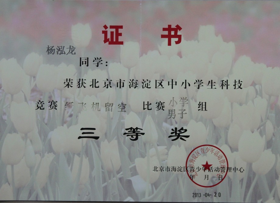 我校杨泓龙“纸飞机留空”竞赛二等奖