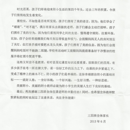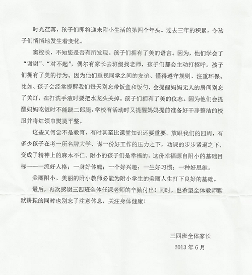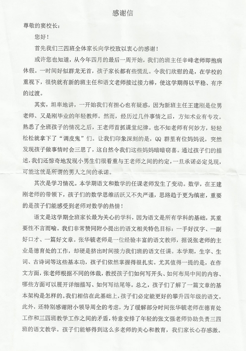 来自三(4)班全体家长的感谢信