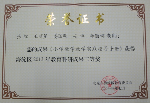 我校数学团队的科研成果《小学数学教学实践指导手册》被评为海淀区2013年教育科研优秀成果。
