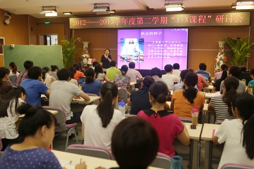 本学期“1+X课程”硕果累累,获得领导、专家、家长、学生的一致好评,已经成为我校、海淀区、北京市的一张名片。“1+X课程”构建到了深水期,如何使其迈入新的高度,7月8日,我校全体教师再一次齐聚闻道厅共话“1+X课程”。