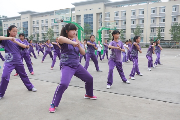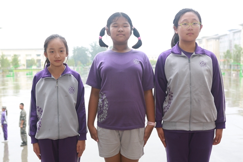 女生方队则是在进行分列式的 练习,丰富多样的队列队形变换,看得人眼花缭乱。“首长好,为人民服务”的口号声清脆响亮,宛然一支三军女兵仪仗队在接受首长的检阅。