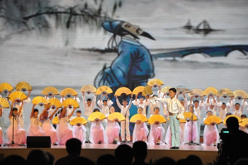 合唱团演唱的歌曲《读唐诗》,歌声有如天籁,伴随着书法家的泼墨挥毫,古色古香。把观众带入如诗如画意境中。
