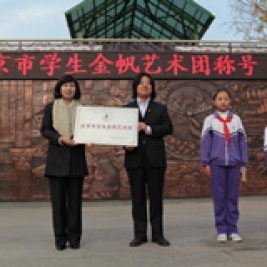 北京市教委授予我校民乐团为北京市学生金帆艺术团,图为窦校长把从北京市教委接过来的金帆艺术团标牌郑重的交给吴跃猛老师。