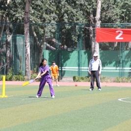 车老师转了一圈,纠正同学们的不规范动作。然后,车老师开始上前示范击球动作。他告诉我们:“眼睛要盯着球来的方向,板子平行于地面,双脚前后分开。然后,让板子近手的地方低,另一头高,同时,左脚向前一大步,让板子沿身压下去,像打高尔夫球一样。”