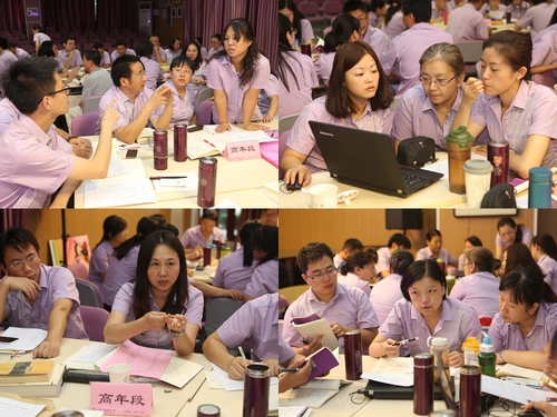 两位主讲人抛出三个问题:如何通过课程背景分析、设置课程内容?如何通过课程的实施落实课程目标?如何通过课程评价检验课程内容的有效性?教师们围绕这三个问题进行课程编制的现场实练,用“做中学”的方式在小组积极合作、讨论,通过不断的交流、碰撞,厘清了课程编制的思路,彼此分享了课程编制的初步成果,在学习共同体中实现了共赢,将会场氛围推向了高潮。