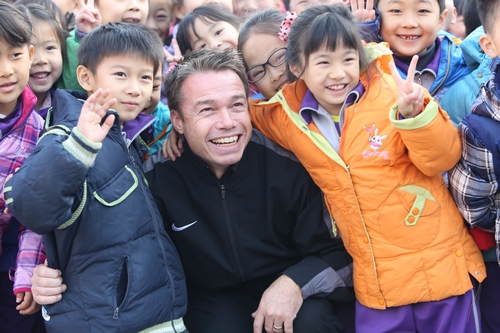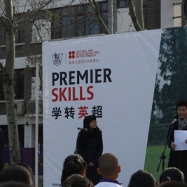 在此次体育节启动仪式中,北京体育大学毽球代表队的大姐姐们和我校男、女两支长绳队的同学们为我们带来了精彩的表演,同学们不停地为他们欢呼鼓掌,气氛非常高涨。我们还邀请了来自英国的著名足球明星格里姆先生以及他们的团队,为我们的启动仪式助威。“学转英超”活动在我校举办的非常成功,学生们在体验足球的乐趣中,不但激发了兴趣,同时也学到了很多的足球本领。