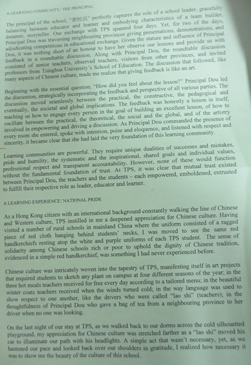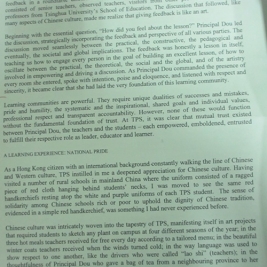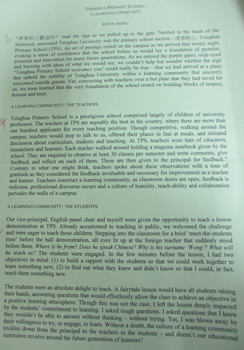 清华附小是一所享有盛誉的学校,学校里大部分学生来自清华大学的教授子弟;这里的教师毋庸置疑也是最好的,因为每一个岗位都有上百个竞争者在为之努力。即使是这样一个竞争激烈的地方,当你走在学校里,仍然可以看到教师们停下忙碌的身影与我们交流,吃饭的时候互相谦让,并且不时地讨论课程,学生以及教学方面的事情。在这里,教师是教育者,探索者同时也是学习者。当你走在校园里,你可以看到每个教师手中都有一个紫色的记录本,这个记录本是学期初发给每位教师的。在这里,每个教师每学期需要至少听其他教师30节课,写出批注并且及时把反馈和教师沟通,期末教师需要把这些批注交到校长那里。教师们把一些有价值的,对一名教师同样也是学习者而言能够帮助其提高的反馈及时与教师沟通。教师们成立一个学习共同体,他们敞开门欢迎这种及时的反馈;谦虚向其他老师请教提高自己的教学能力,这样的氛围遍布校园。