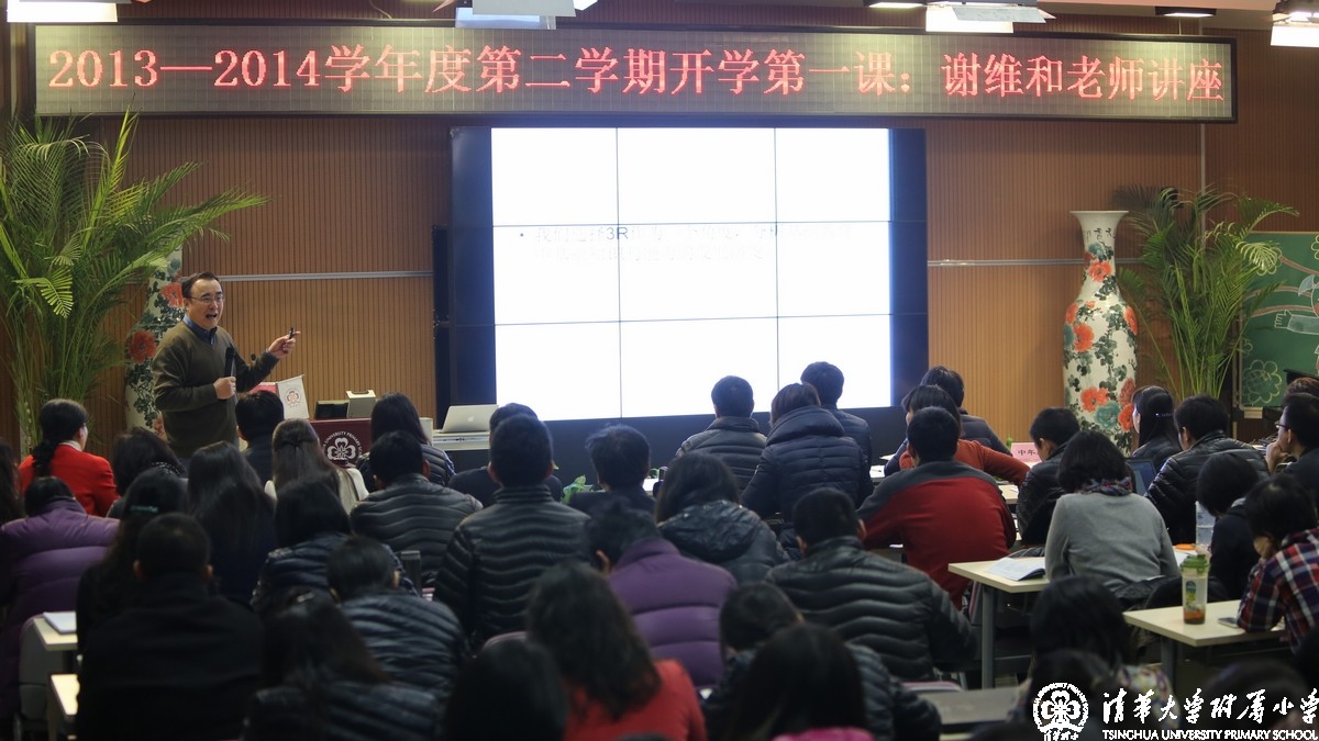2014年2月15日,清华附小召开2013——2014学年度第二学期动员会。我校非常荣幸的邀请到清华大学副校长谢维和老师来给我们上第一节课:《基础教育3R的研究和分析》。清华附小本部及CBD分校的全体教师及家委会代表参加了此次动员会。