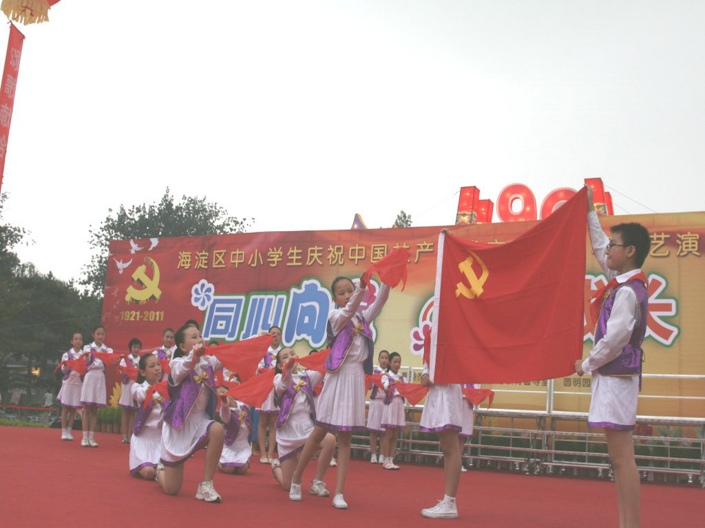 为庆祝中国共产党成立90周年,2011年7月1日晚18:30,中共海淀区委教育工作委员会、海淀区教育委员会、海淀区人民政府教育督导室,在圆明园公园南门外广场上组织了“同心向党,快乐成长”文艺演出,我校四年级部分学生参加了演出。