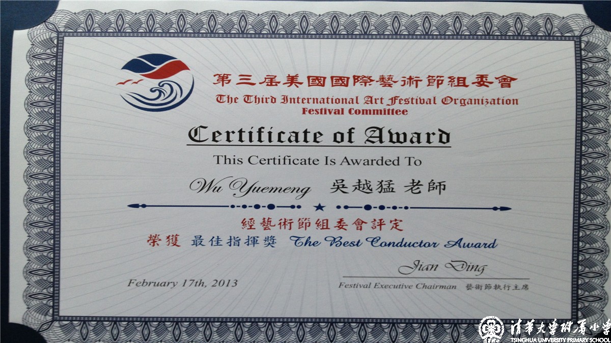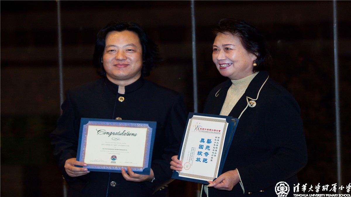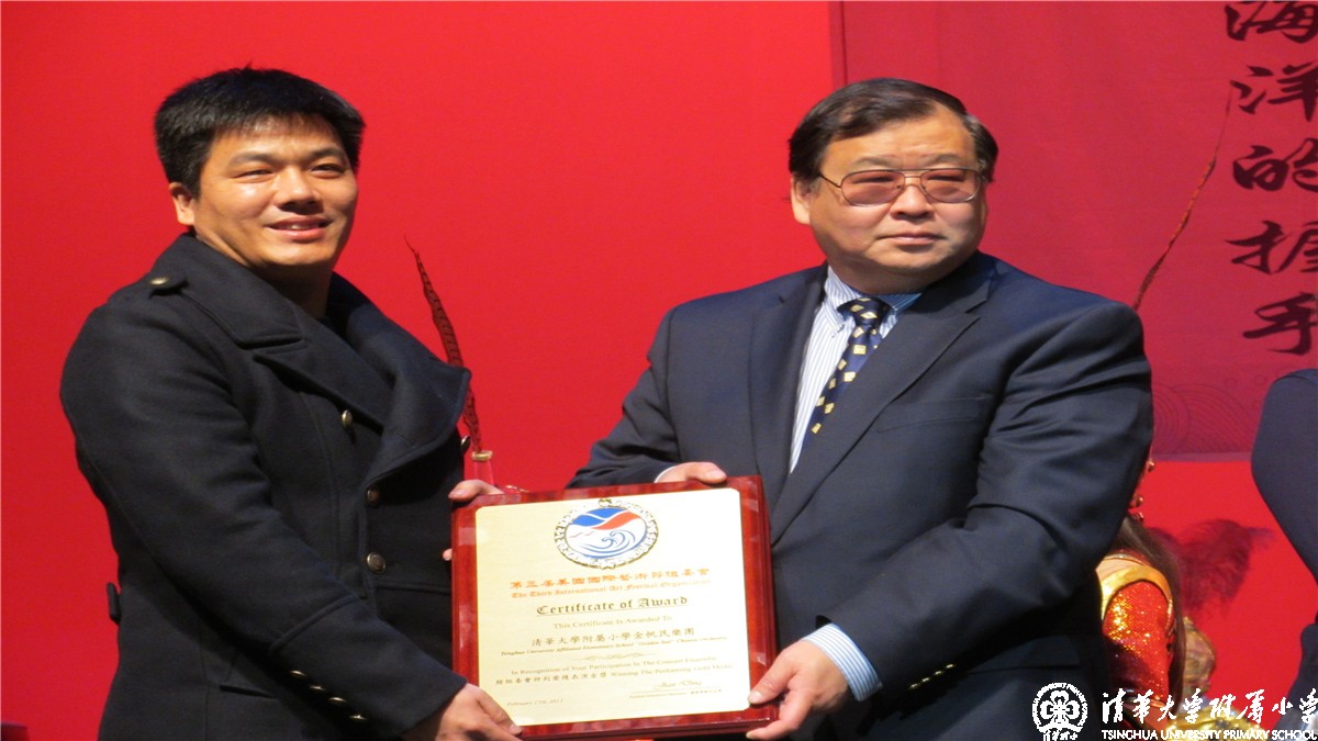 - 图为清华大学美国旧金山校友会秘书长为我校金帆民乐团指挥吴跃猛老师颁发奖状