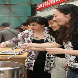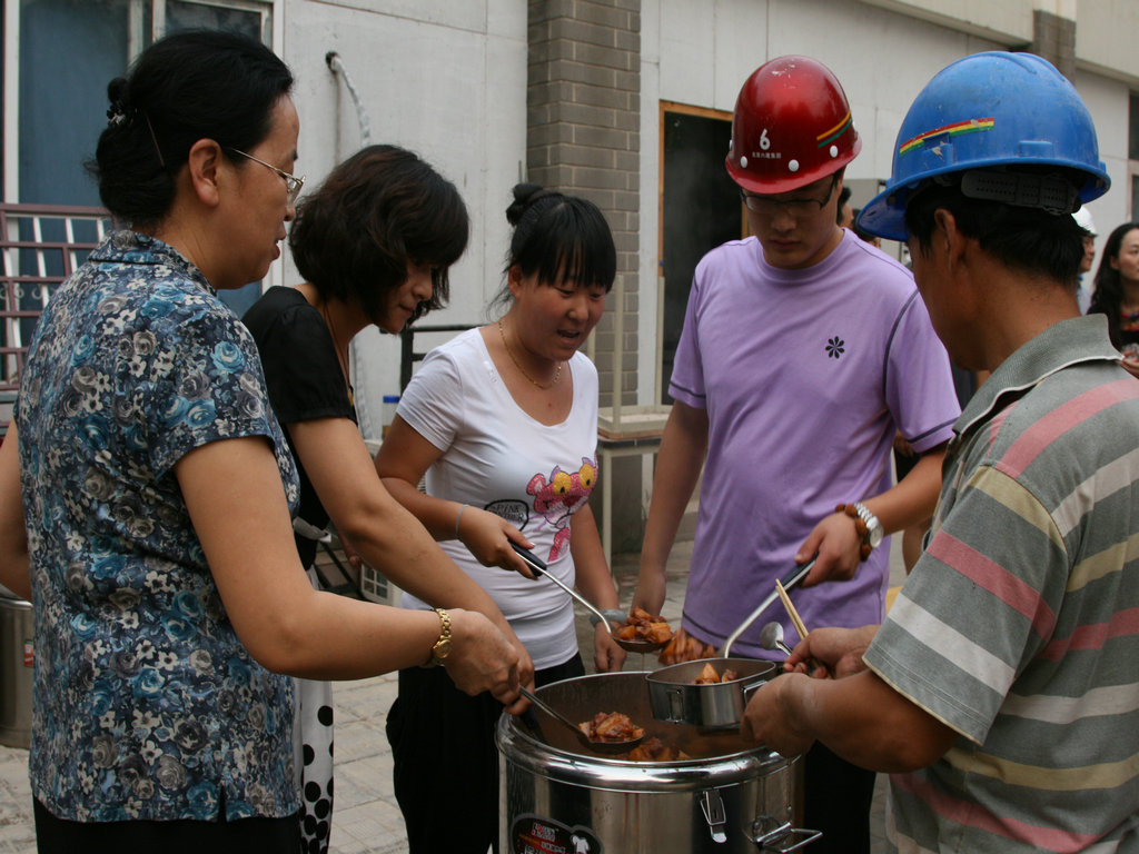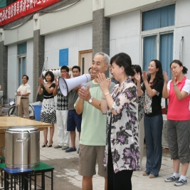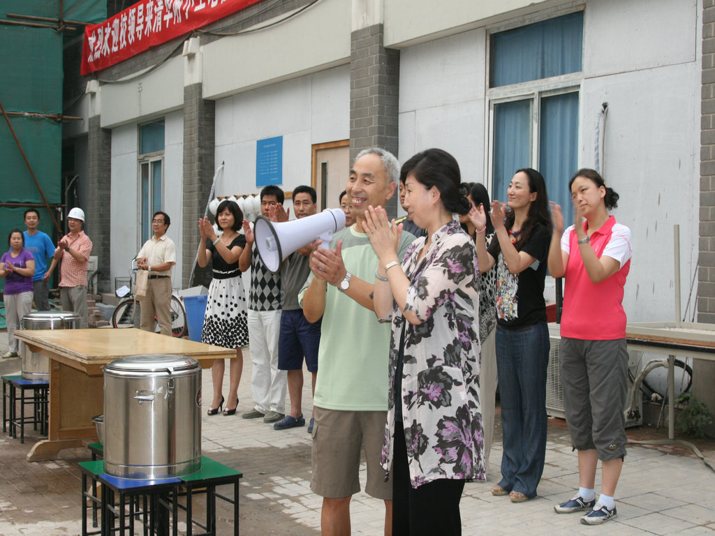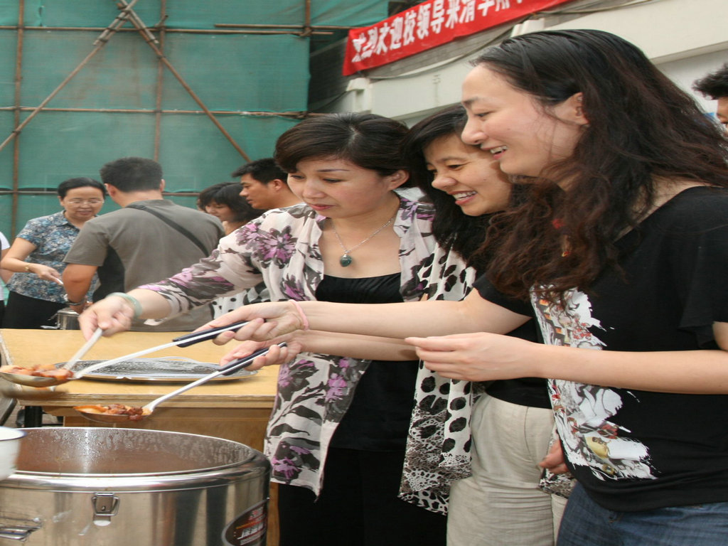 2011年7月14日下午,我校领导班子一同慰问了坚守在附小工地的工人们,并送去了美味可口的红烧肉。窦校长与附小领导班子亲自为工人们盛菜,表达对工人们的感谢。