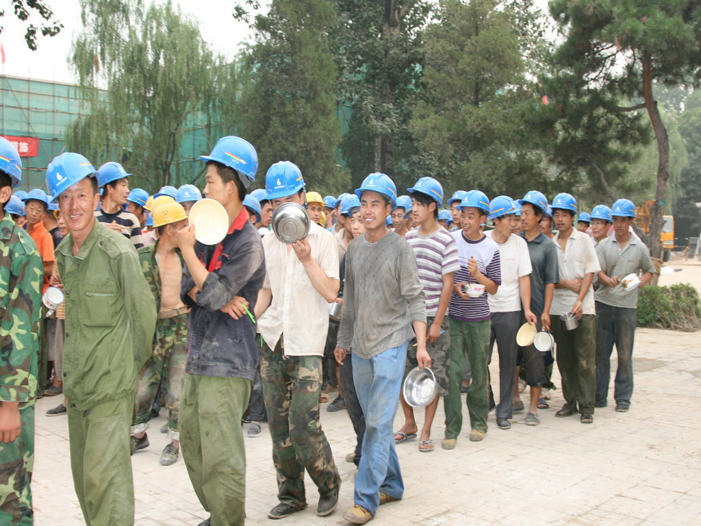 工人们有序的排队盛餐