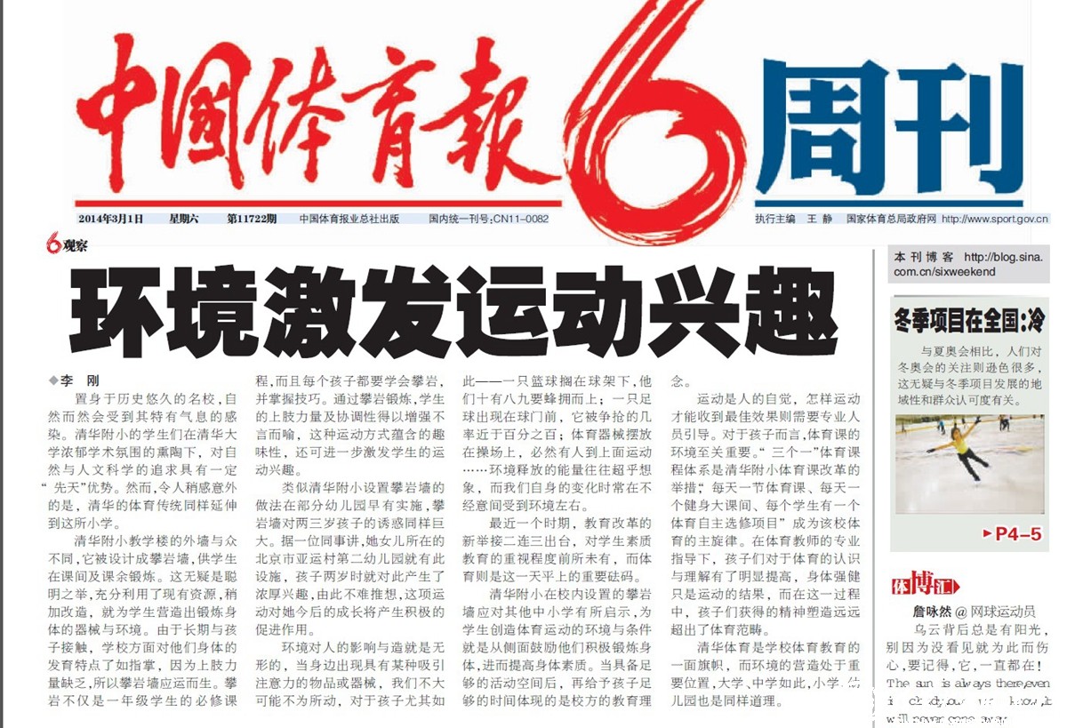 置身于历史悠久的名校,自然而然会受到其特有气息的感染。清华附小的学生们在清华大学浓郁学术氛围的熏陶下,对自然与人文科学的追求具有一定“先天”优势。然而,令人稍感意外的是,清华的体育传统同样延伸到这所小学。清华附小教学楼的外墙与众不同,它被设计成攀岩墙,供学生在课间及课余锻炼。这无疑是聪明之举,充分利用了现有资源,稍加改造,就为学生营造出锻炼身体的器械与环境。由于长期与孩子接触,学校方面对他们身体的发育特点了如指掌,因为上肢力量缺乏,所以攀岩墙应运而生。攀岩不仅是一年级学生的必修课程,而且每个孩子都要学会攀岩,并掌握技巧。通过攀岩锻炼,学生的上肢力量及协调性得以增强不言而喻,这种运动方式蕴含的趣味性,还可进一步激发学生的运动兴趣。