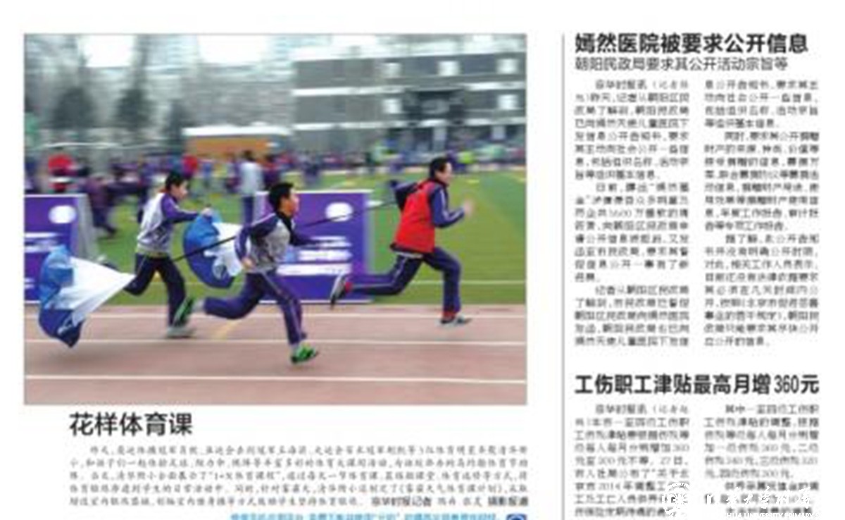 花样体育课 昨天,奥运体操冠军肖钦、亚运会击剑冠军王海滨、大运会百米冠军胡凯等3位体育明星齐聚清华附小,和孩子们一起体验足球、阻力伞、绳阵等丰富多彩的体育大课间活动,为该校举办的马约翰体育节助阵。当天,清华附小全面展示了“1+X体育课程”,通过每天一节体育课、晨练微课堂、体育选修等方式,将体育锻炼渗透到学生的日常活动中。同时,针对雾霾天,清华附小还制定了《雾霾天气体育课计划》,采取增设室内锻炼器械、创编室内健身操等方式鼓励学生坚持体育锻炼。 京华时报记者陶冉张灵摄影报道