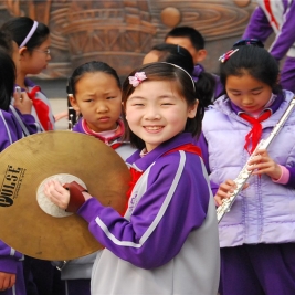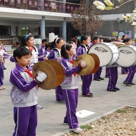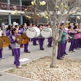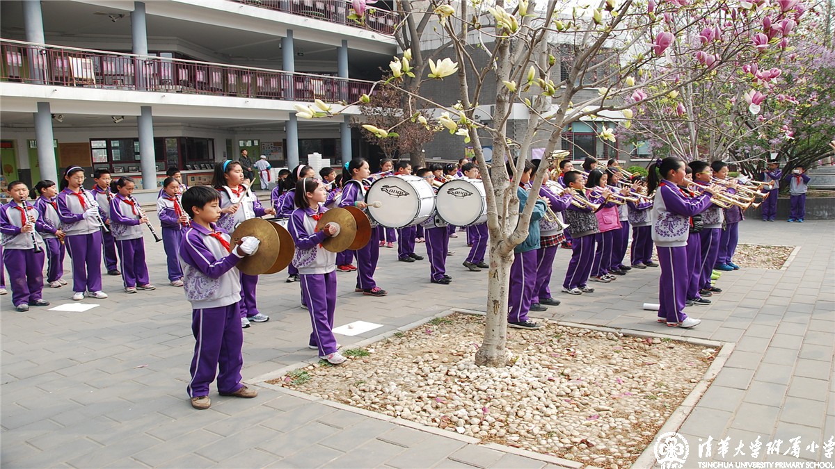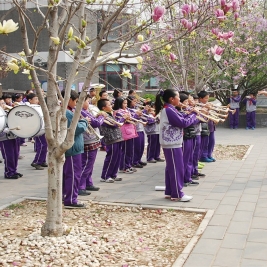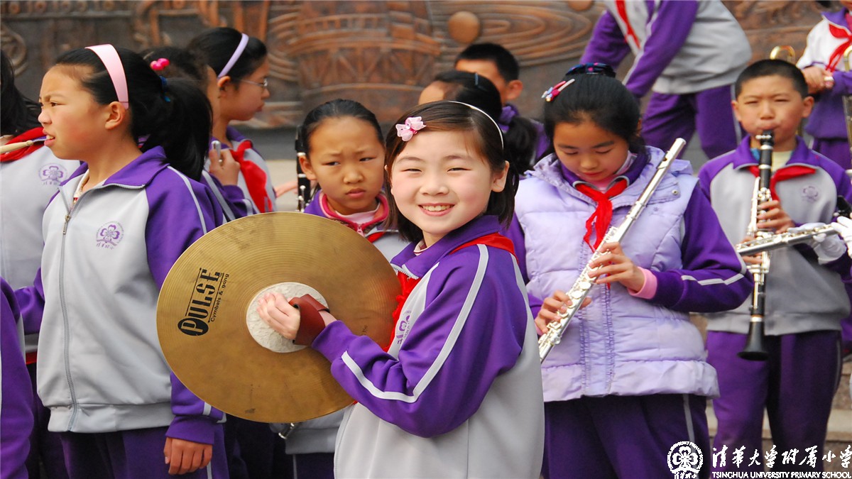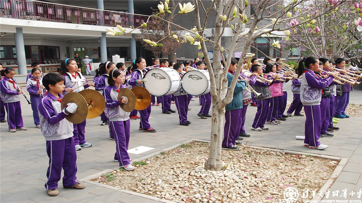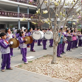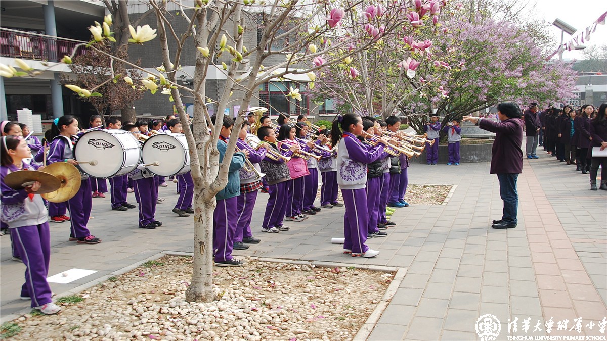 图为2013年3月25日(周一)我校的“管乐团”初建成,队员们正在升旗仪式上庄严的奏响国歌,乐团的队员均来自于我校金帆民乐团。