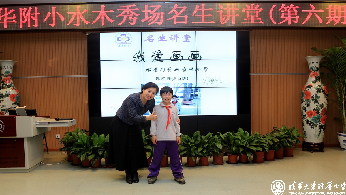 水木秀场名生讲堂第六期主讲人是三(5)班魏亦博同学,他分享的题目是“我爱画画——水墨丹青与自然科学”,讲述他如何将绘画爱好融合在科学探索之中,不断挑战自己的绘画主题,不断的追求卓越,荣获全国书法现场总决赛银奖的历程和成长故事。