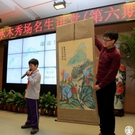 水木秀场名生讲堂第六期主讲人是三(5)班魏亦博同学,他分享的题目是“我爱画画——水墨丹青与自然科学”,讲述他如何将绘画爱好融合在科学探索之中,不断挑战自己的绘画主题,不断的追求卓越,荣获全国书法现场总决赛银奖的历程和成长故事。