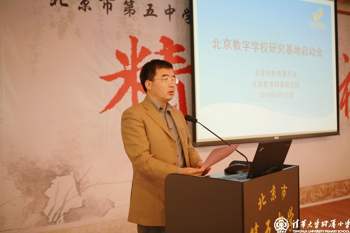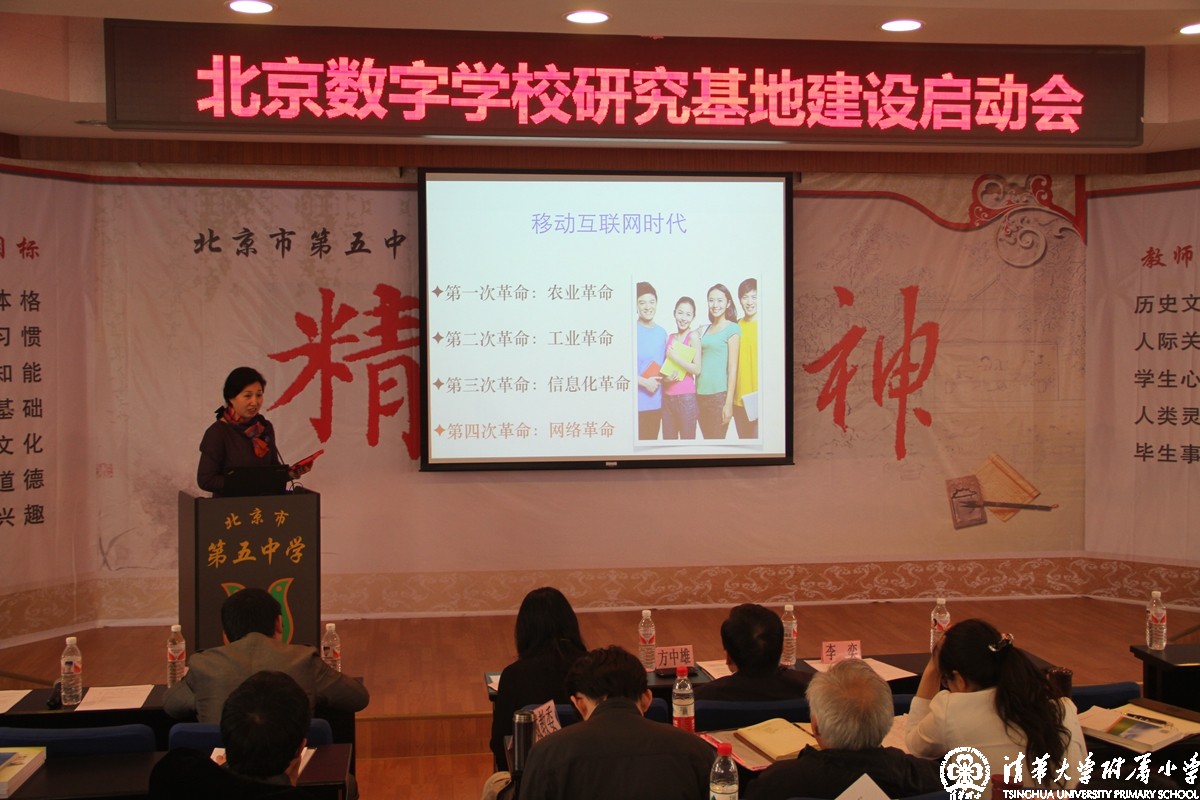 启动会首先由北京数字学校贾美华主任介绍《北京数字学校研究基地工作指南》。随后,北京市教委李奕委员宣布清华附小等25所学校成为北京数字学校研究基地。清华附小作为小学代表,加入北京数字学校MOOC联盟。清华附小窦桂梅校长做大会发言。窦校长在发言中特别提到,清华附小在移动互联网时代的挑战下,必须要赢在对新生事物的“赢天时、拥地利、化人和、尽人需”上、必须要做出有品牌、有内涵、有高度的小学经典阅读课程。最后,北京教科院方中雄院长对所有研究基地校都给与了很高的评价。