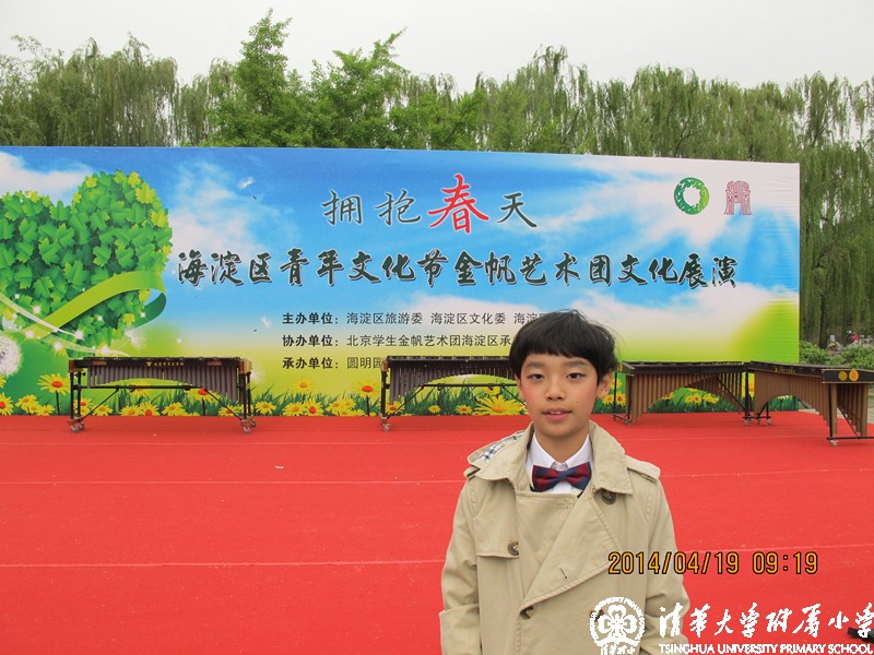 今年圆明园踏青节的主题是“春暖合家欢 爱聚圆明园”,来自海淀区中小学校的北京市学生金帆艺术团、海淀区学生银帆艺术团的学生为大家呈献了精彩的文艺表演,展现了首都青少年的艺术水平。我校六年级5班龚近琦同学应邀代表我校参加了本次演出活动,表演了独唱《草原上升起不落的太阳》,他精彩的演唱,在赢得了台上台下阵阵掌声的同时,也充分展现了我校学生人人“一项好才艺”的艺术风采。