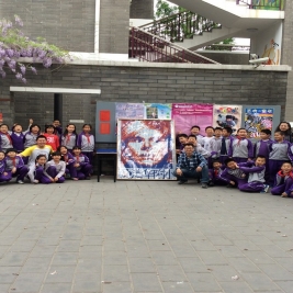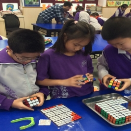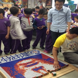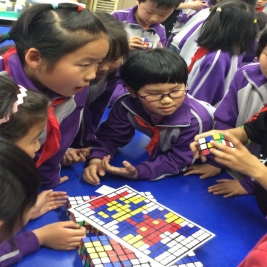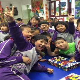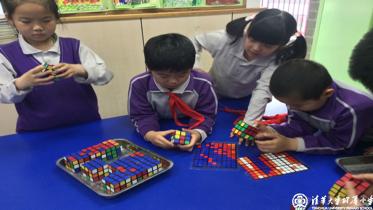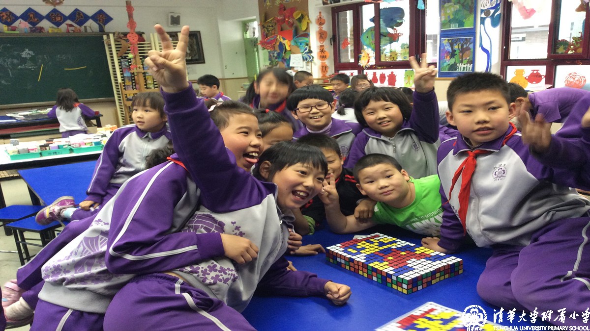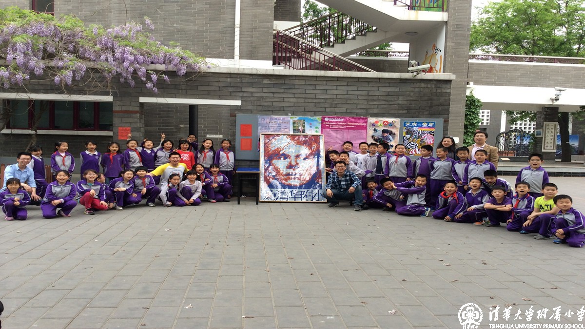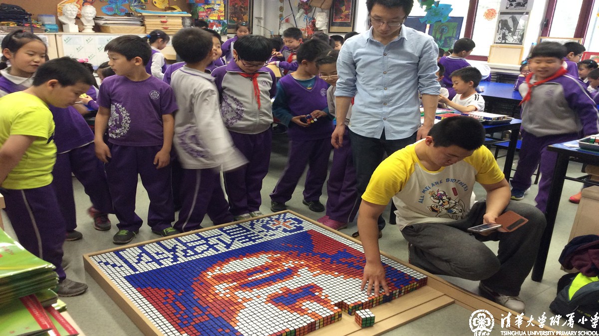 4月18日下午创新实践课,三六班全体同学在我们的校友北京市三阶魔方速拧冠军姜天兆哥哥的带领下用整整一下午时间用六百多个魔方拧成特定的颜色拼凑在一起,利用魔方的颜色来构造出一副带有清华附小标志的人物图像。