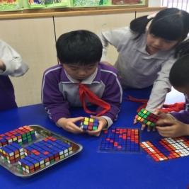 这幅图像是全班小组合作,3人左右一组,共15组,每组发放40多个魔方。学生们用魔方完成要求的图案,将分块的图案按照编号顺序码放到订做好的魔方架子中,并做最后调整才完成的。通过这次魔方实践课,我们很好的训练眼力、耐力、手力、记忆力、空间判断力、右脑能力、注意力、反应速度等等,更重要的是通过这次集体协作,我们知道了团结协作和遵守组织纪律的重要性。