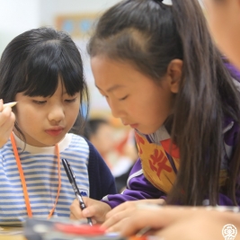 下午两点,开展“游清华风物,观艺术童年”清华附小高学段联合主题班会,许长亮老师号召五六年级以班号为单位,以“搭对子”的形式有序进入清华校园进行参观游览。“游清华风物,观艺术童年”清华附小高学段联合主题班会以进入清华园为主题。各个班的小导游精心准备,讲述清华的历史与现在,传递清华人的“自强不息”。游园的最后一站是正在清华美院开展的“艺术的童年”——清华附小学生自己的书画展。在展览现场可以看到清华附小每个孩子的作品,附小的学生向培小的学生认真地介绍自己的作品,并合影留念。