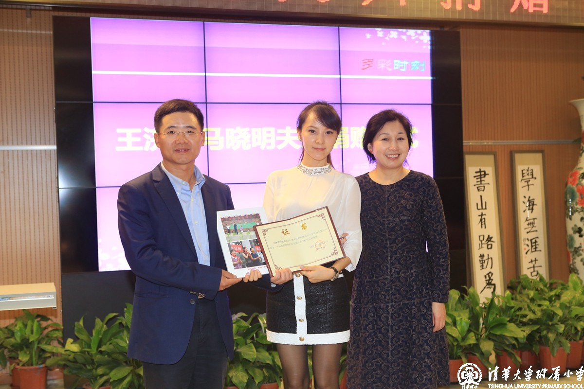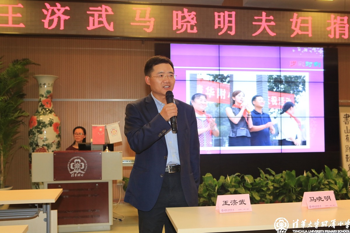 窦桂梅校长代表清华附小向王济武、马晓明夫妇颁发了捐赠证书,并代表全体师生对王济武校友和马晓明校友长期以来对于附小的关心、支持和帮助表示衷心的感谢。她表示这笔捐款将用做优秀教师奖励基金,为清华附小的教师队伍建设发挥重要作用。