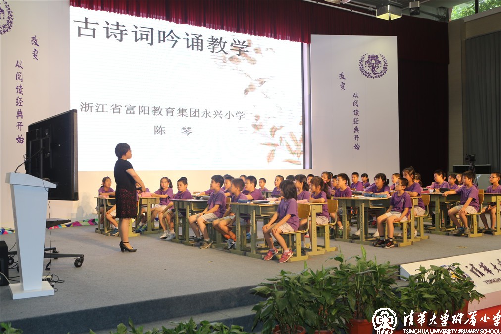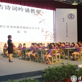 窦校长致欢迎辞,表达了我校对优秀传统文化的重视和对专家和兄弟学校的欢迎。接着,我校国学特色班三年级六班同学吟诵《论语》、《春江花月夜》、《爱莲说》和《诗经·木瓜》等经典展示了我校的吟诵课程。培训的主体是全国著名特级教师陈琴带来了“吟诵之美”的主题讲座和诗歌教学公开课。这次培训既有理论又有实践,老师们认识到吟诵是高效的学习方法,用这种方法,不仅记得牢,而且理解得深。吟诵是传承中国文化精神的重要手段。吟诵里面,包含了中国文化精神的精髓,无处不渗透着中国文化对世界和人生的理解。吟诵的方法,以及经过吟诵以后的诗文内容,都把中国文化的精神本质表现出来,对学生起到了潜移默化的作用。