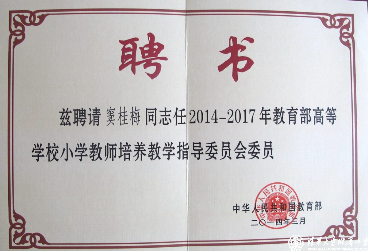为深入贯彻落实党的十八大和十八届三中全会精神,全面落实教育规划纲要,充分发挥专家学者对教师教育改革的研究、咨询、指导作用,推动教师教育内涵式发展,大力提升教师培养质量。教育部成立教育部高等学校小学教师培养等教学指导委员会,我校窦桂梅校长被聘为教育部高等学校小学教师培养教学指导委员会委员。