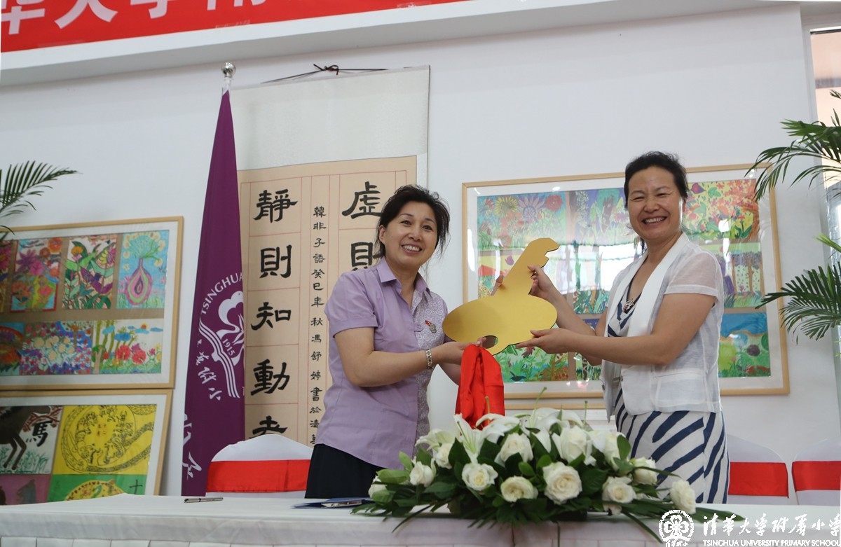 随后,三方领导走上台前,签署交接协议。窦桂梅校长代表清华附小昌平学校接过象征着产权交接的金钥匙,三方合影留念。
