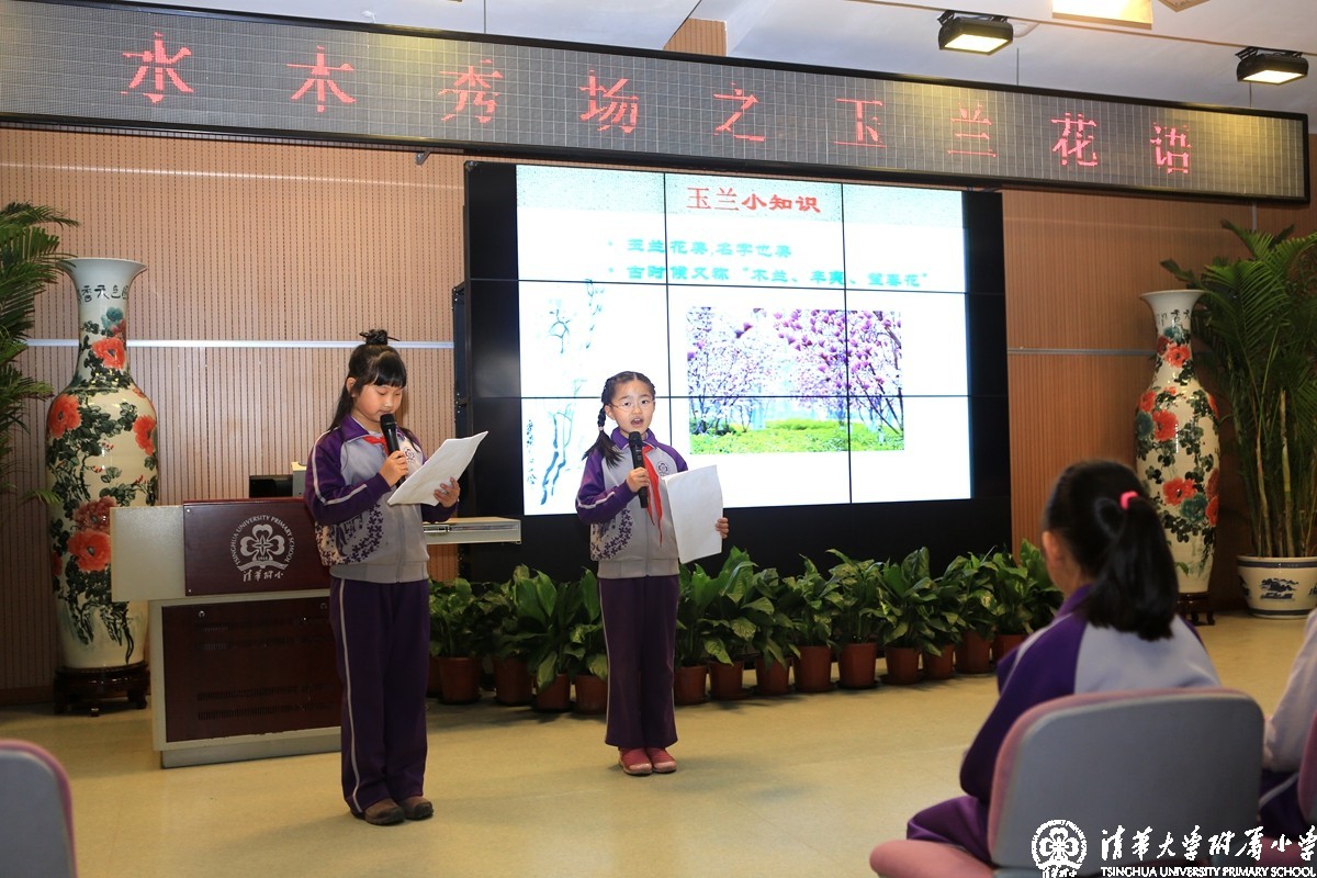4月3日,附小几株玉兰玉树临风,花团锦簇之时,三(6)班孟靖媛、张涵玢两位同学在闻道厅给全校百余名师生带来了“玉兰花语”讲座。讲座开始前,三(3)班三位学生代表向全校师生发起了保护花草树木的倡议。接着,两位同学介绍了自己与玉兰的故事、如何欣赏玉兰、玉兰的百科知识、玉兰的文化内涵等等。讲座结束后,同学们围在玉兰树下一起欣赏三(6)班同学集体带来的《木兰辞》吟诵。