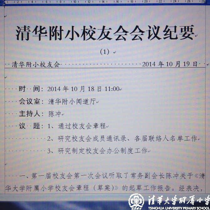 一、会议听取了陈冲关于《清华大学附属小学校友会章程(草案)》的起草工作报告。经表决,与会全体成员一致通过了该章程。