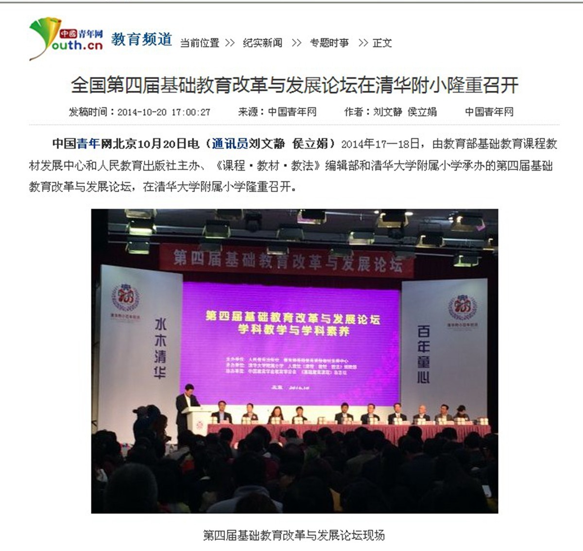 中国青年网北京10月20日电(通讯员刘文静 侯立娟)2014年17—18日,由教育部基础教育课程教材发展中心和人民教育出版社主办、《课程·教材·教法》编辑部和清华大学附属小学承办的第四届基础教育改革与发展论坛,在清华大学附属小学隆重召开。