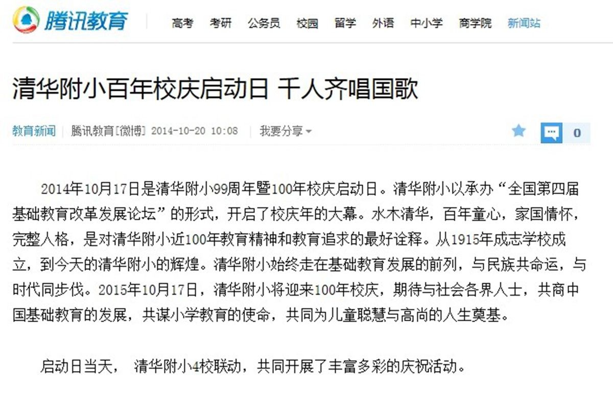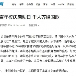 2014年10月17日是清华附小99周年暨100年校庆启动日。清华附小以承办“全国第四届基础教育改革发展论坛”的形式,开启了校庆年的大幕。水木清华,百年童心,家国情怀,完整人格,是对清华附小近100年教育精神和教育追求的最好诠释。从1915年成志学校成立,到今天的清华附小的辉煌。清华附小始终走在基础教育发展的前列,与民族共命运,与时代同步伐。2015年10月17日,清华附小将迎来100年校庆,期待与社会各界人士,共商中国基础教育的发展,共谋小学教育的使命,共同为儿童聪慧与高尚的人生奠基。