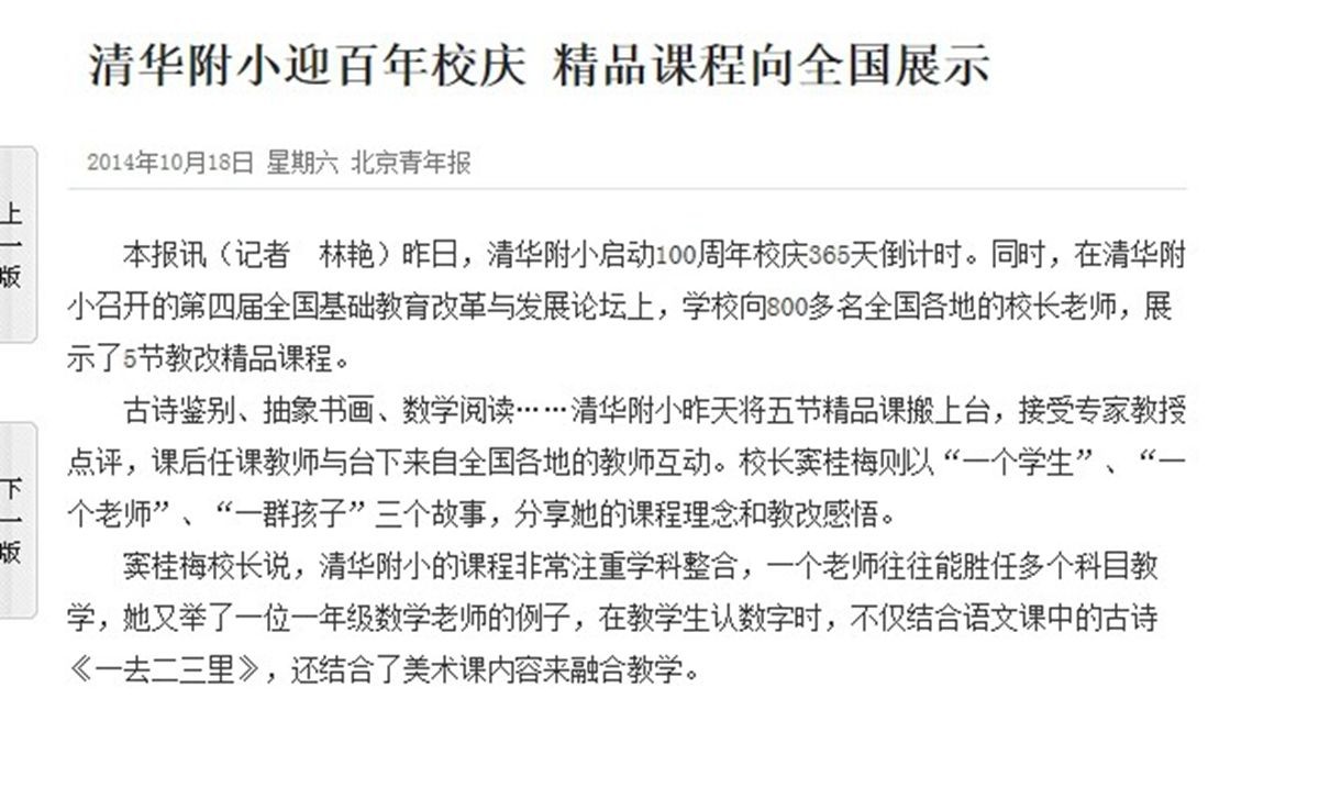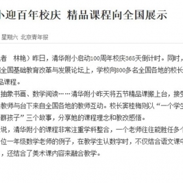 本报讯(记者 林艳)昨日,清华附小启动100周年校庆365天倒计时。同时,在清华附小召开的第四届全国基础教育改革与发展论坛上,学校向800多名全国各地的校长老师,展示了5节教改精品课程。