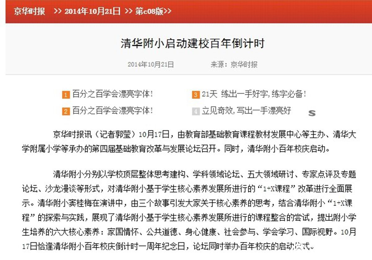 京华时报讯(记者郭莹)10月17日,由教育部基础教育课程教材发展中心等主办、清华大学附属小学等承办的第四届基础教育改革与发展论坛召开。同时,清华附小百年校庆启动。