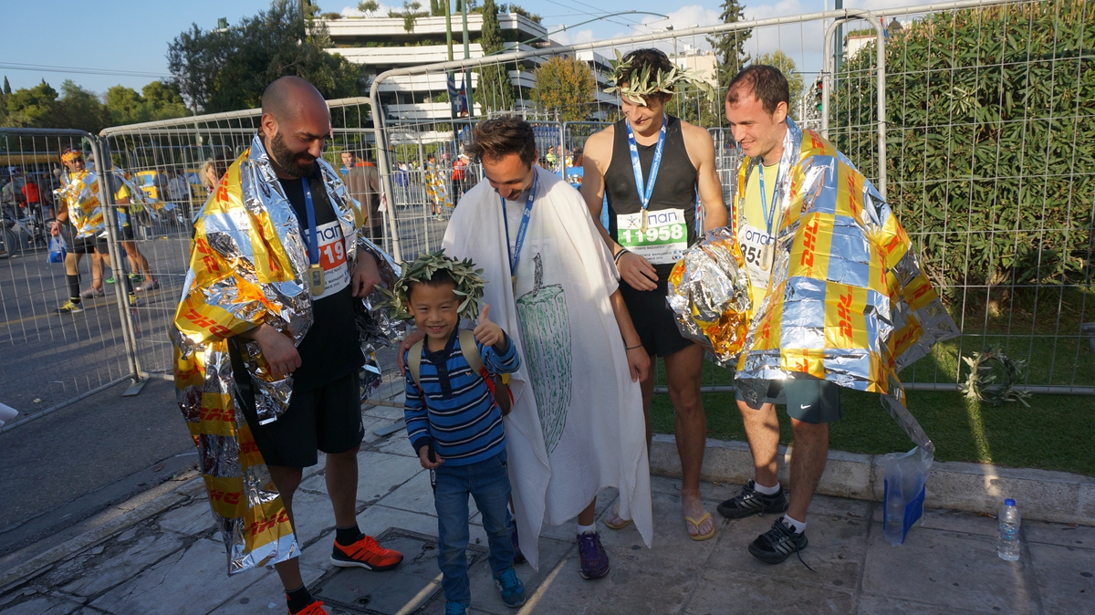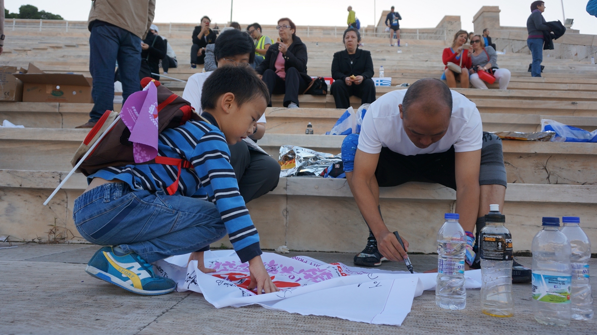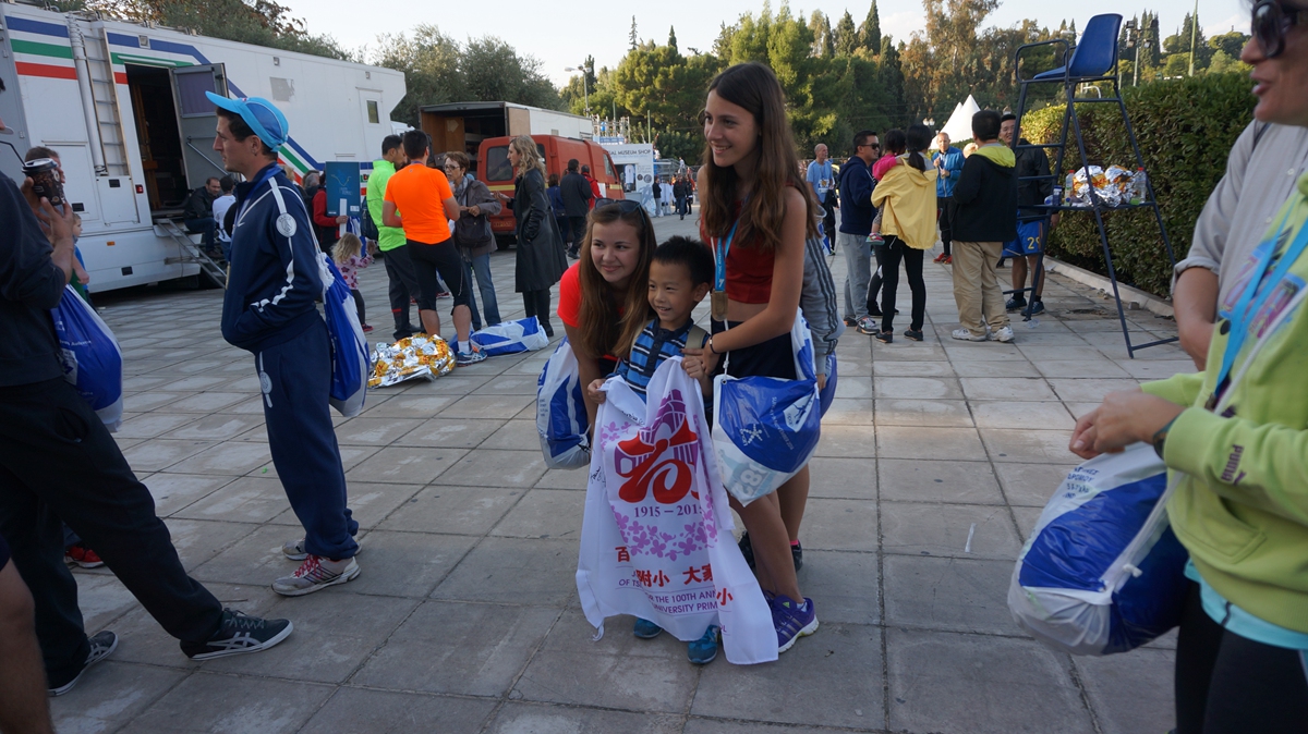 在马拉松终点——大理石体育场(第一届现代奥运会主会场)收集签名。鐾诚从第7个签名开始,就很放松、很流利的用完整的句式求签名了,爸妈小小的欣慰了一下。重在参与、坚持到底、真诚祝福、传递喜悦等等这些正能量的词语,在马拉松全程被印证,被释放。
